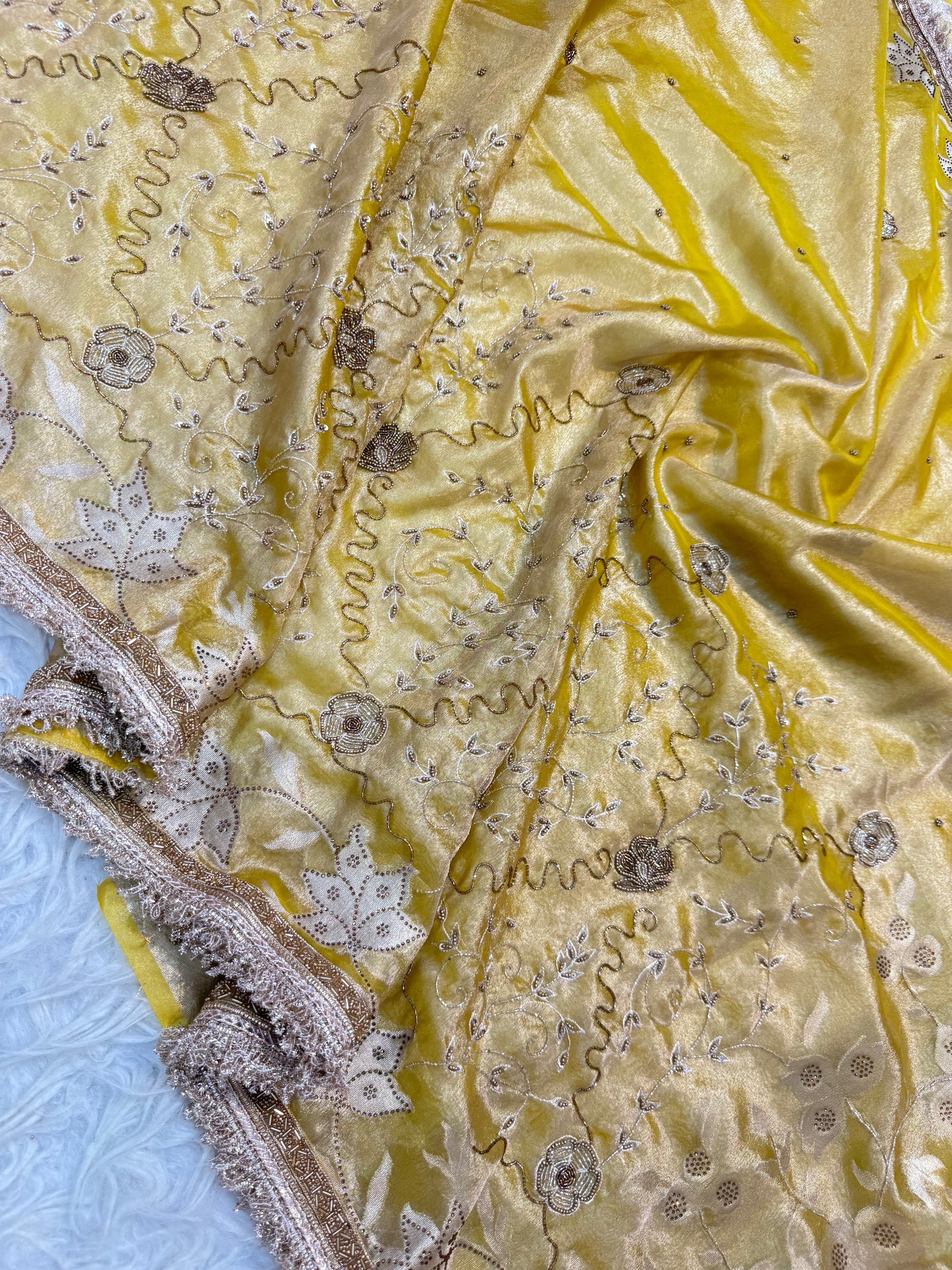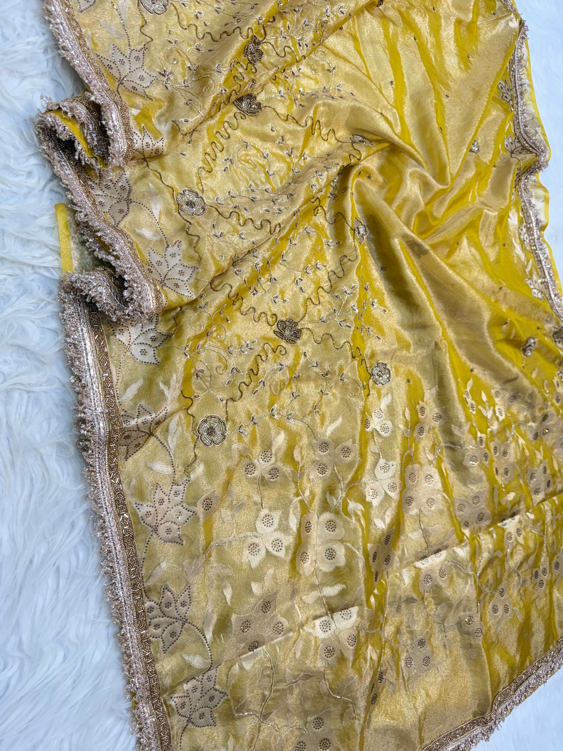 Yellow shade tissue ari & zardosi work designer premium Banarasi saree