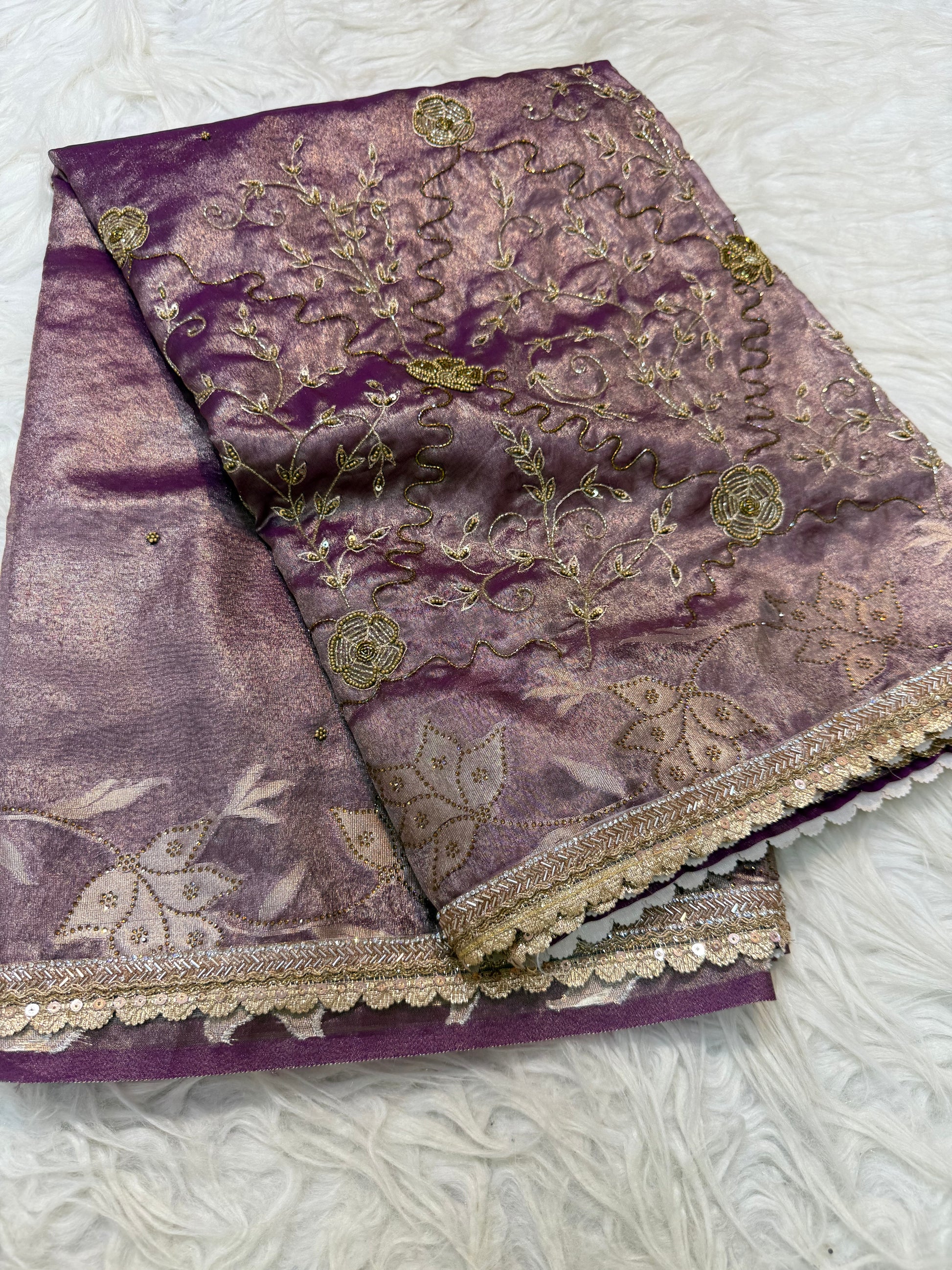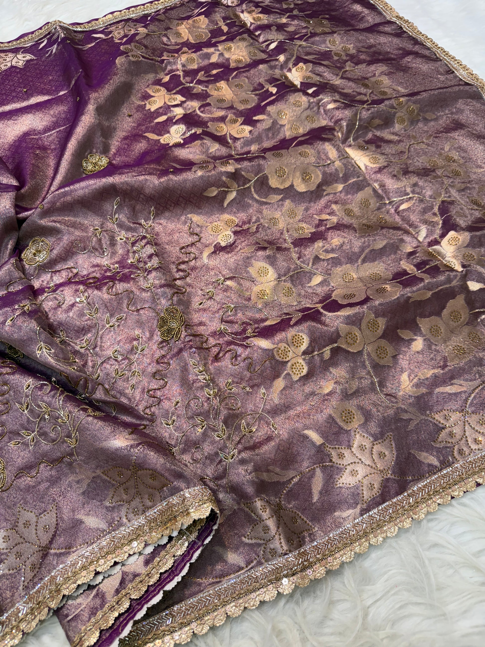 Magenta shade tissue ari & zardosi work designer premium Banarasi saree