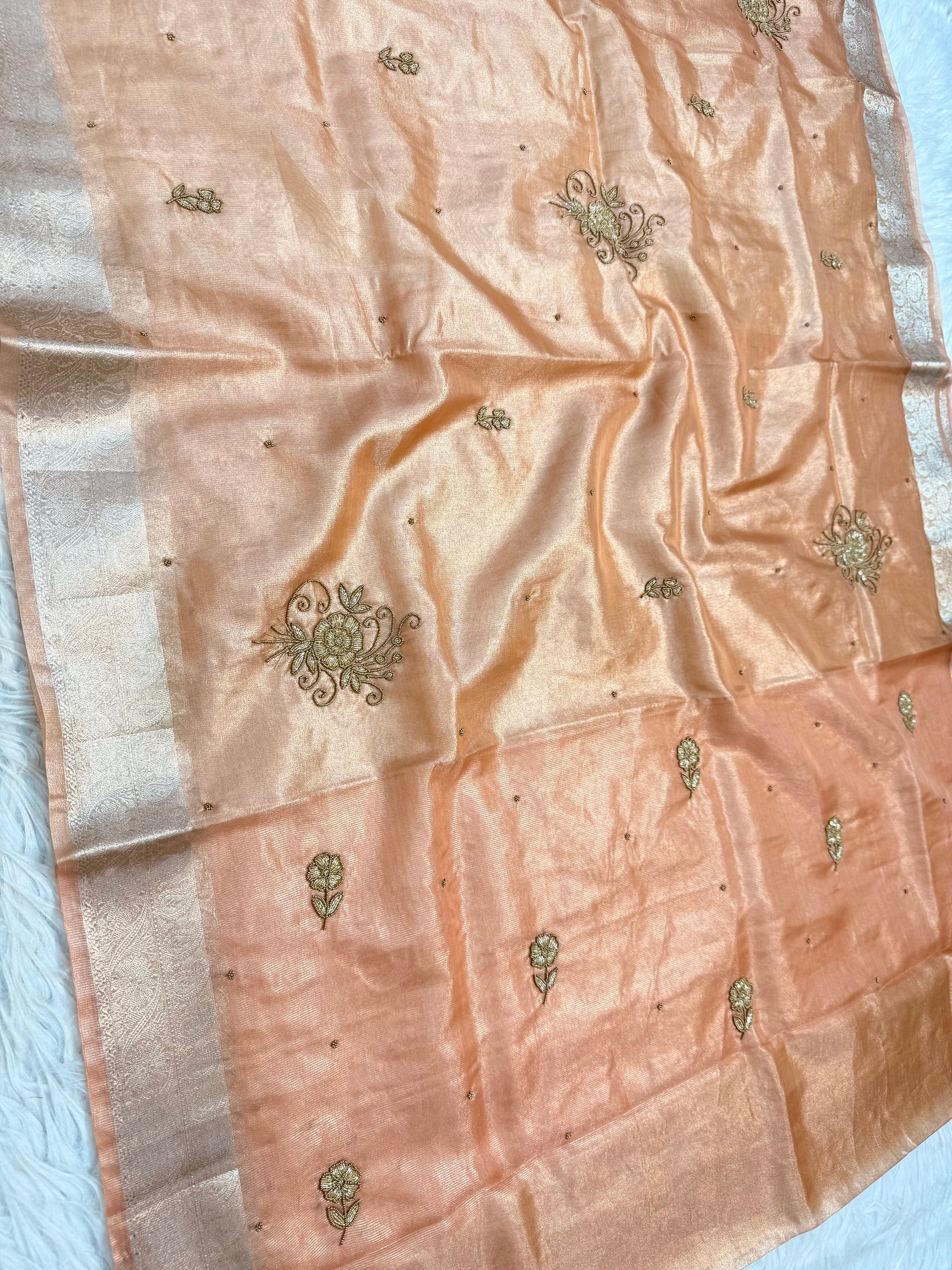 Peach shade tissue ari & zardosi work designer Banarasi saree