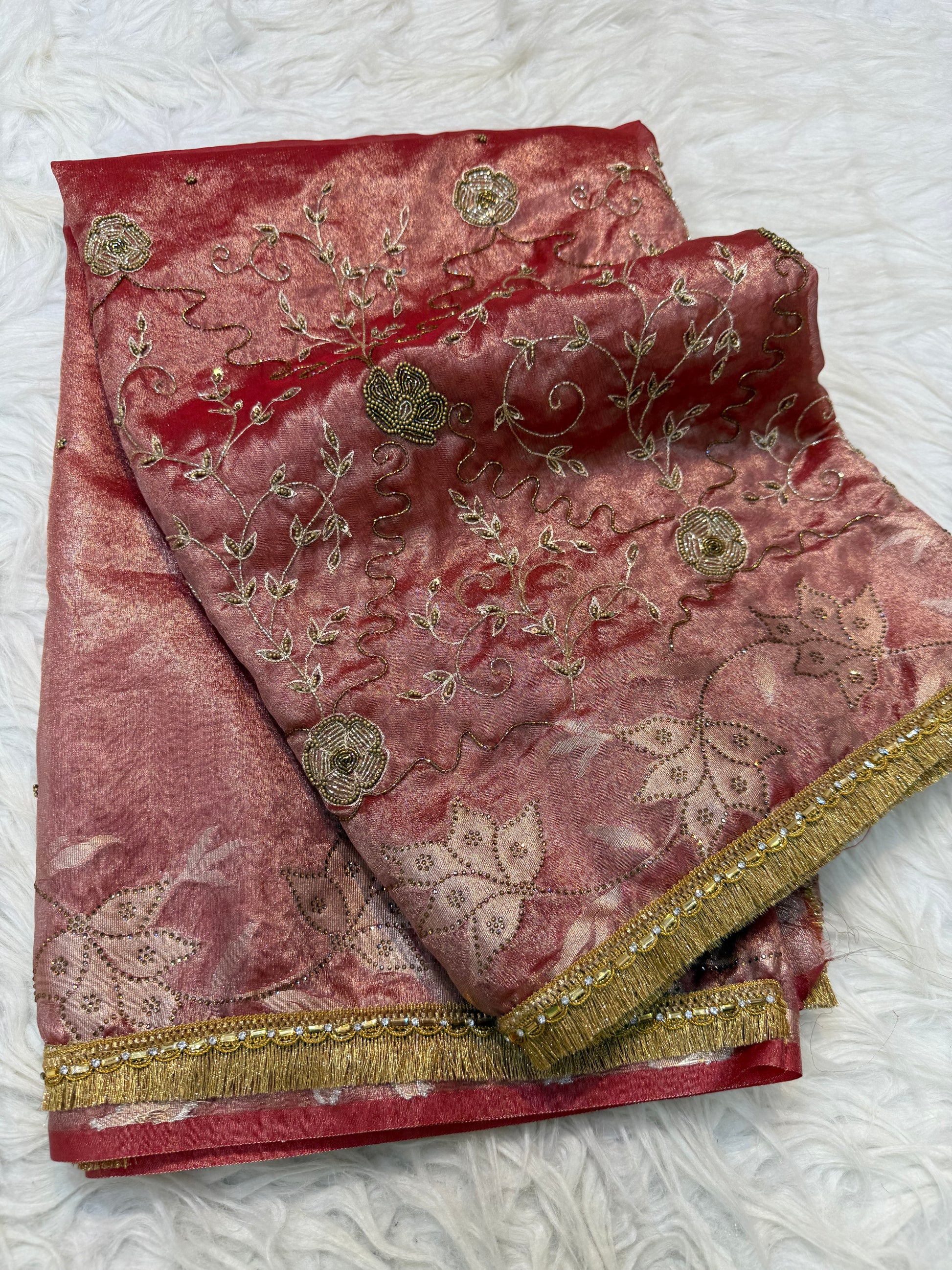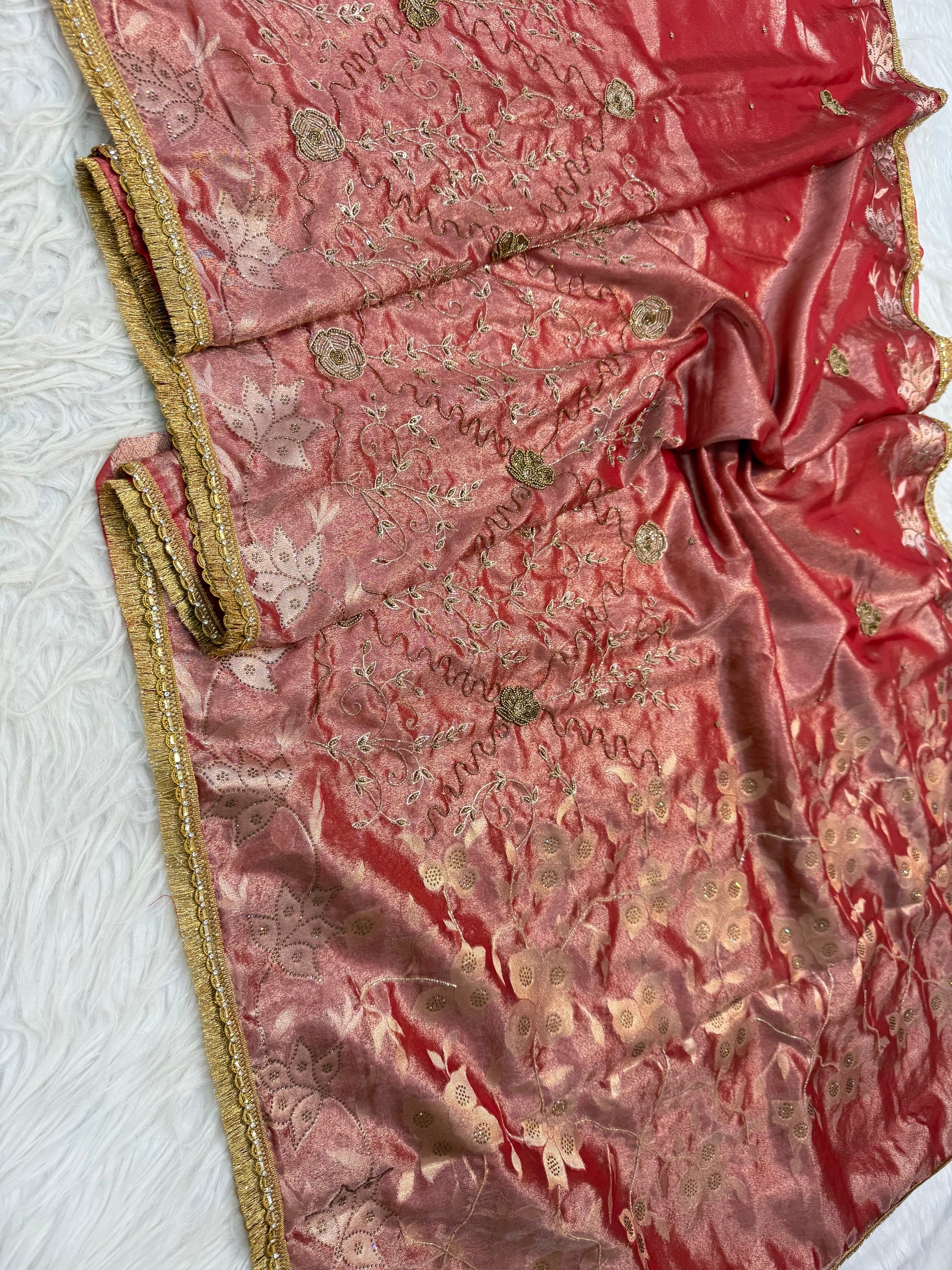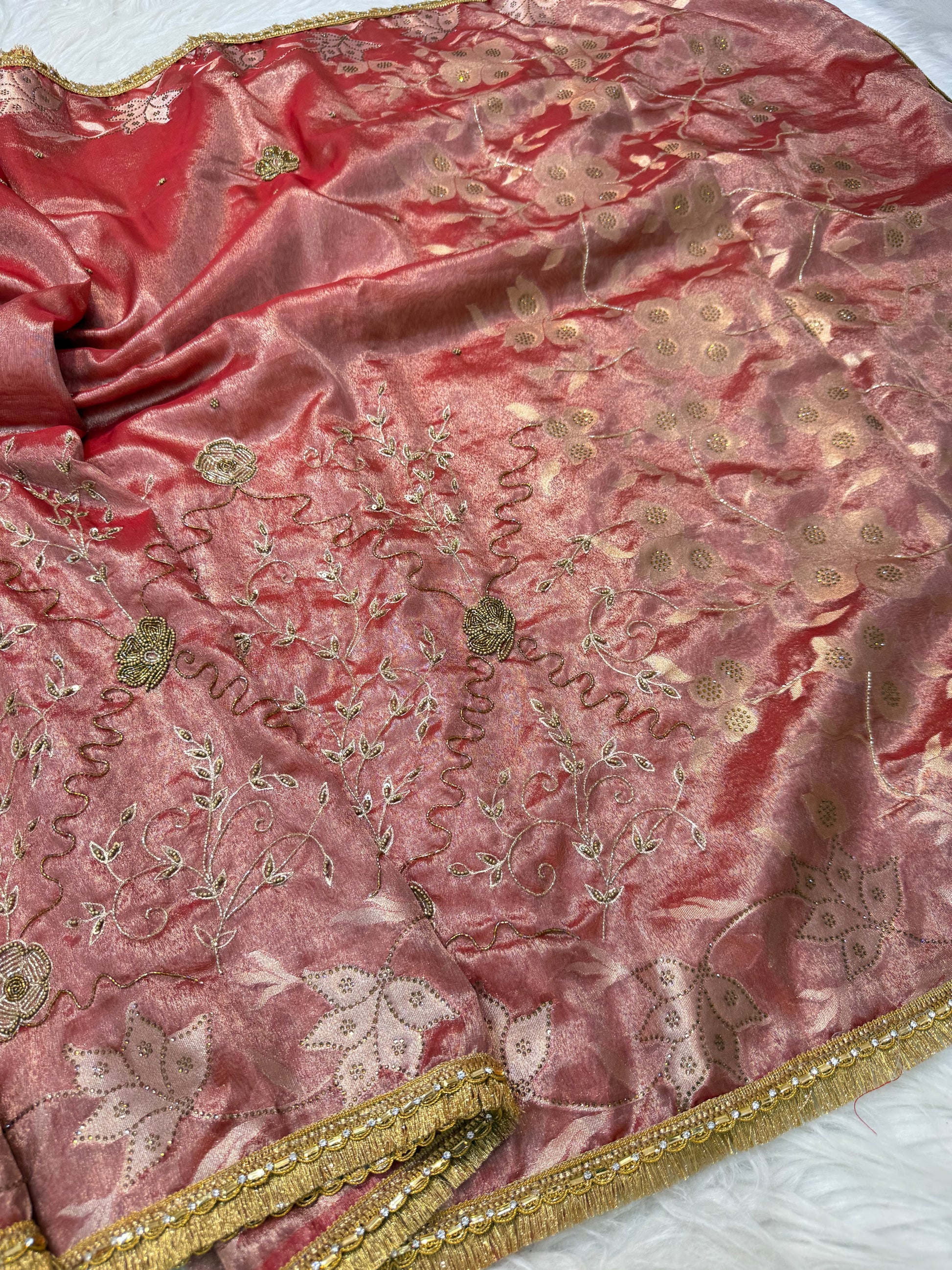 Red shade tissue ari & zardosi work designer premium Banarasi saree