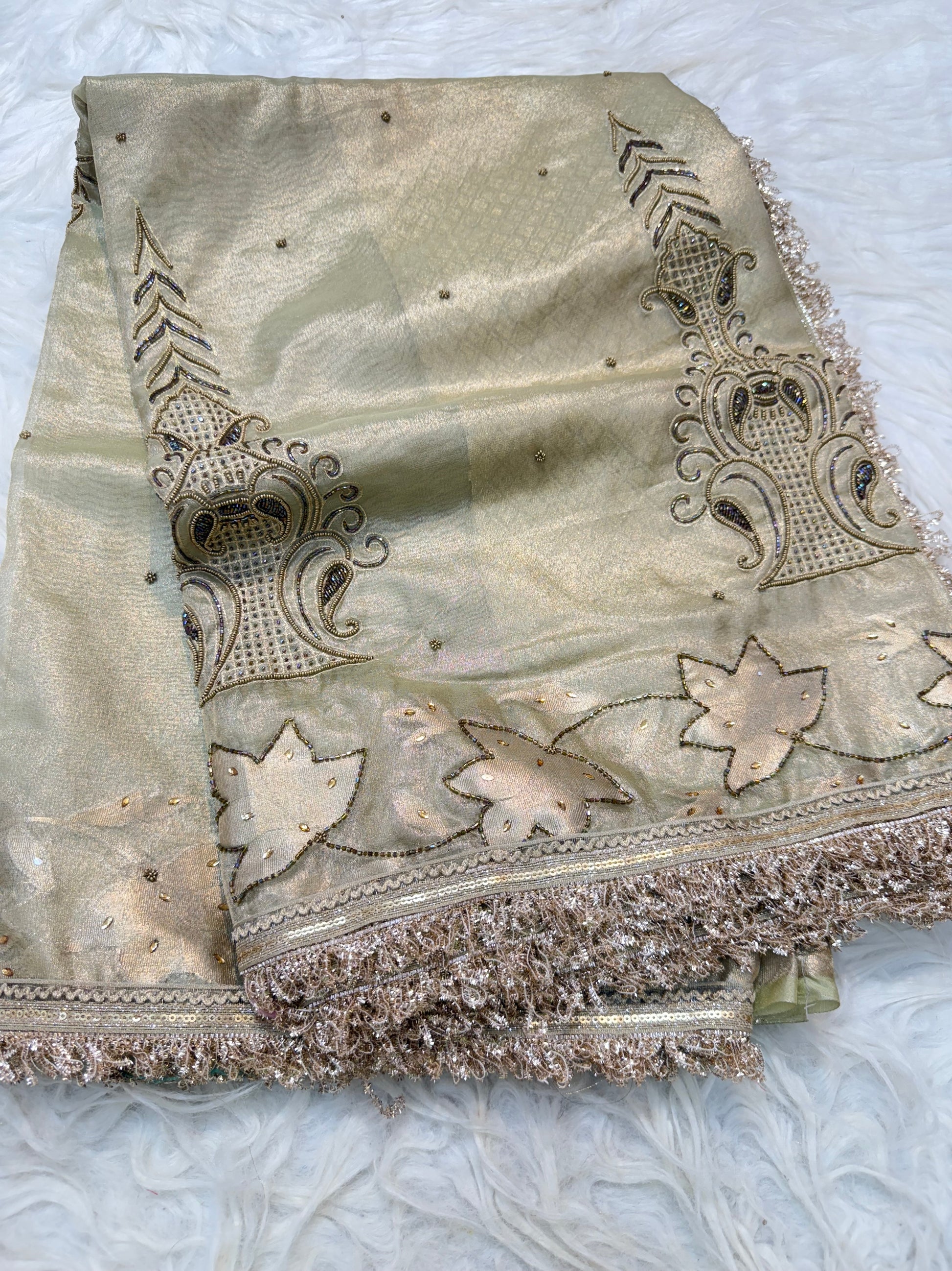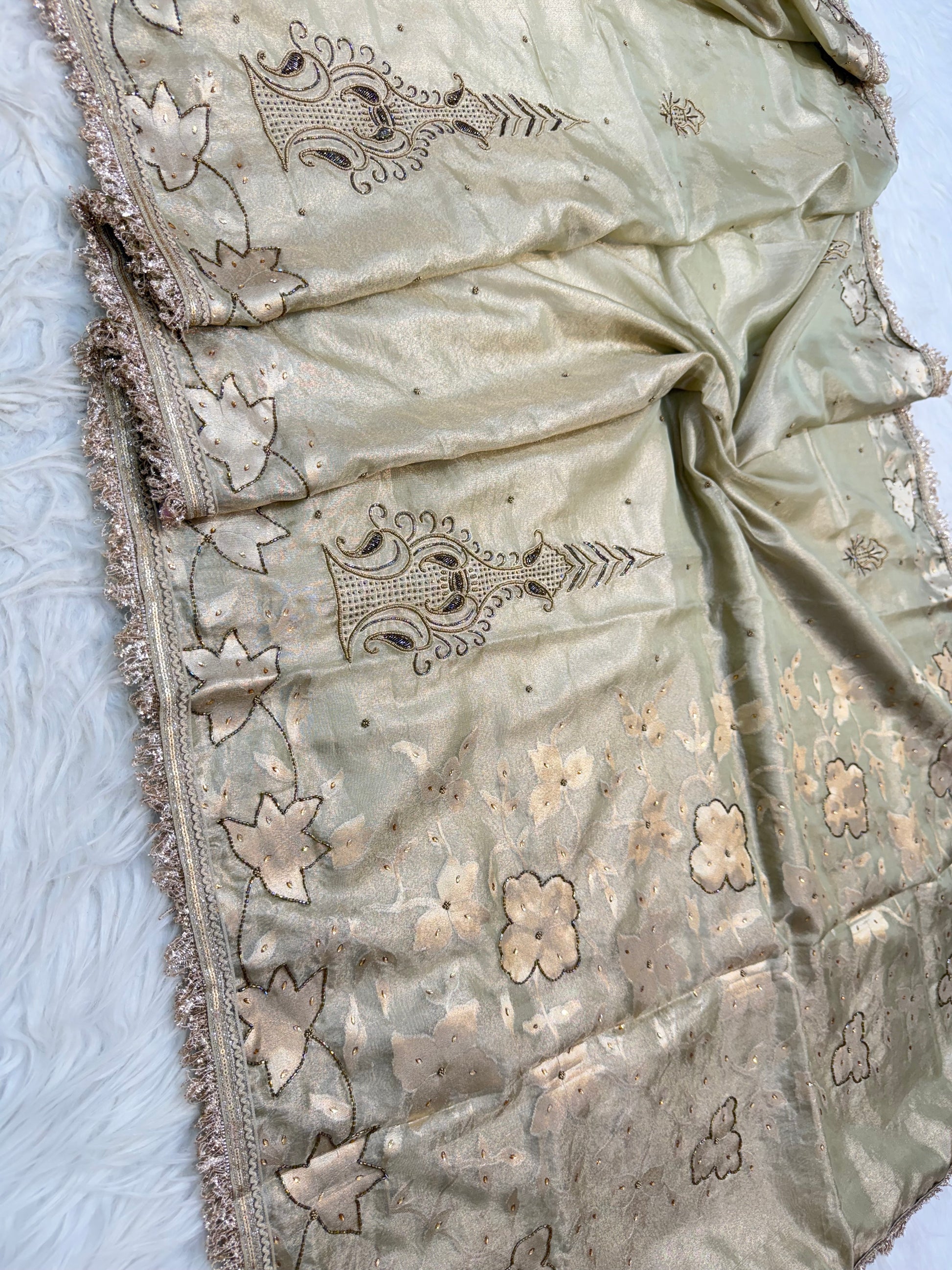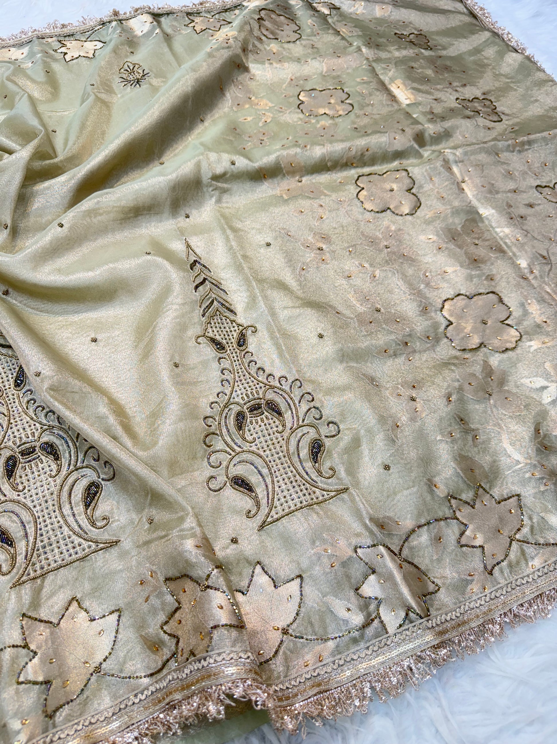 Pista free shade tissue ari & zardosi work designer premium Banarasi saree