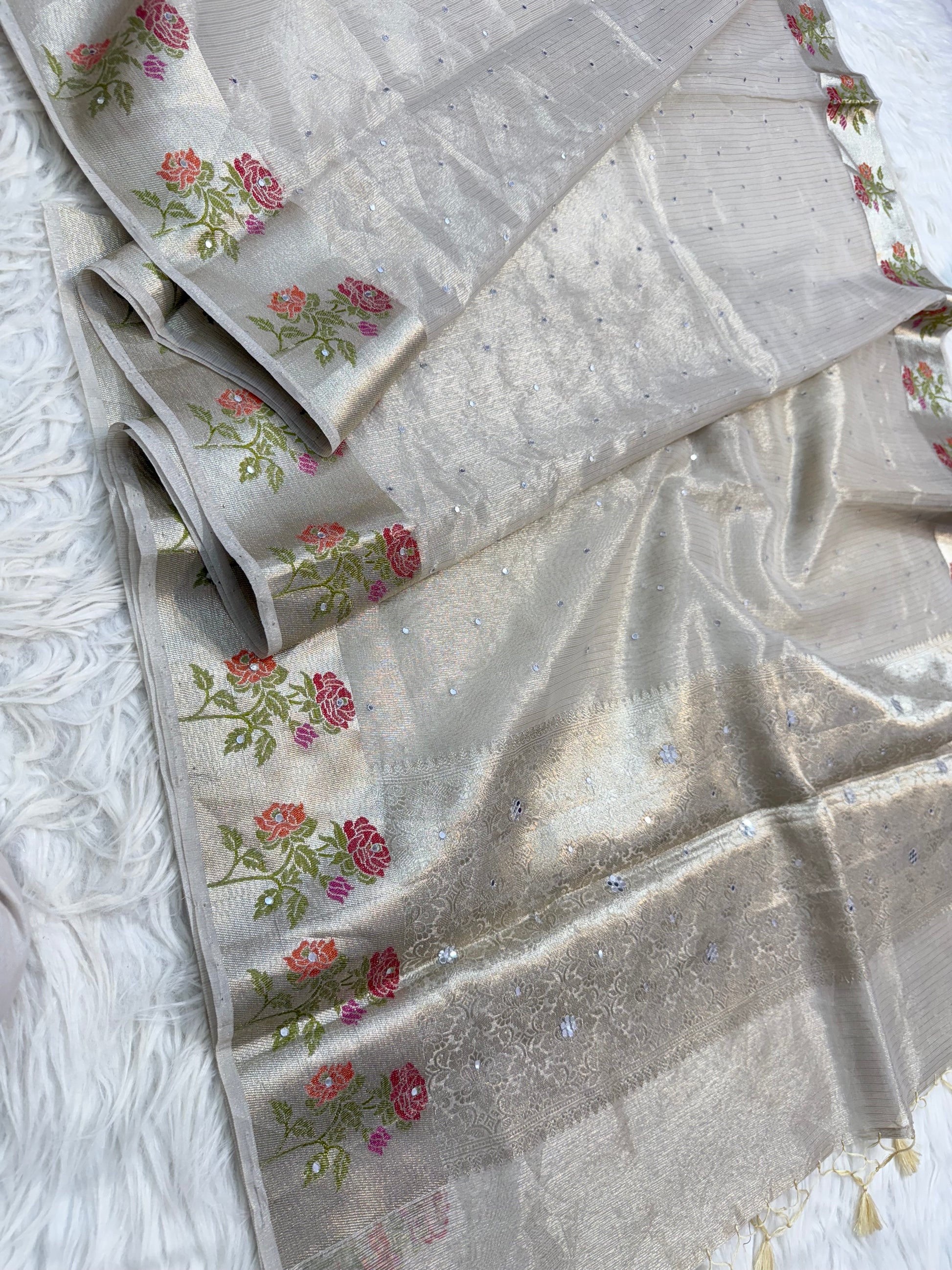 Indulge in luxury with our Tissue Kota Handwork Banarasi Saree by Zahera Silk Banaras. Crafted from the finest tissue silk, this saree exudes sophistication and elegance. The intricate digital print adds an artistic touch, making it a perfect addition to your wardrobe. Elevate your style and make a statement with this exclusive piece.